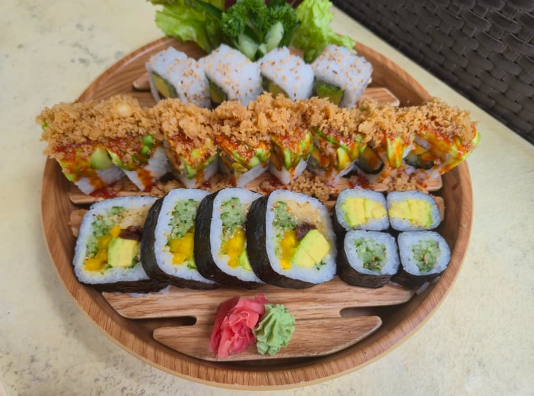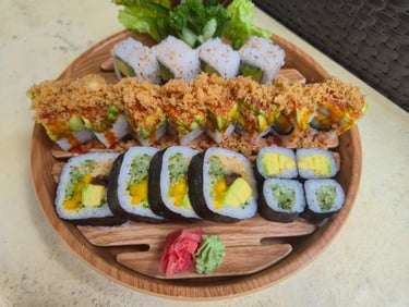 Seasonal Salad, Sushi & California Roll, Tuna Pancake, Prawns, Lobster, Chicken, Beef, Vegetables, Fried Rice & Fresh Fruits or Ice Cream